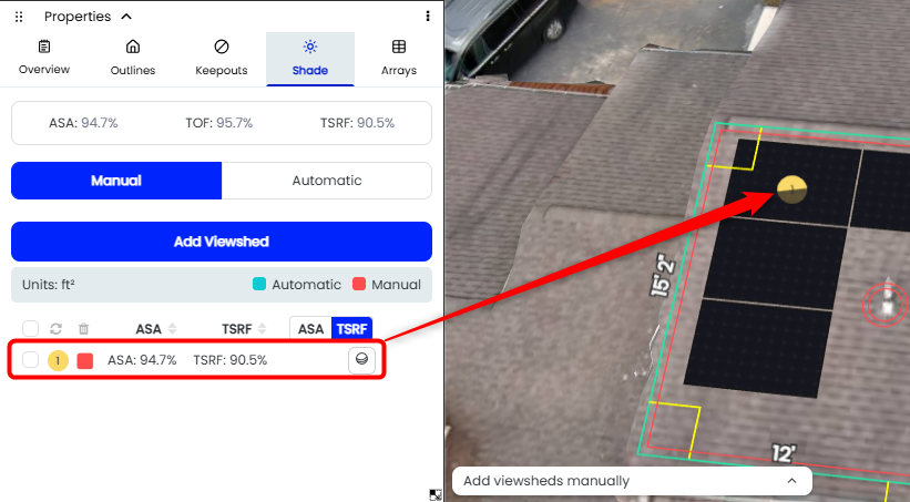 You can place a viewshed manually anywhere on a segment to generate a Solar Access, TOF, and TSRF measurement as well as a viewshed trace and a horizon trace.
