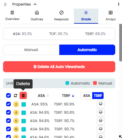 To delete all viewsheds, click the big red button that says "Delete all Auto Viewsheds". If you have any manual viewsheds placed that you want deleted, select them by clicking the checkboxes below and then the trash icon.
